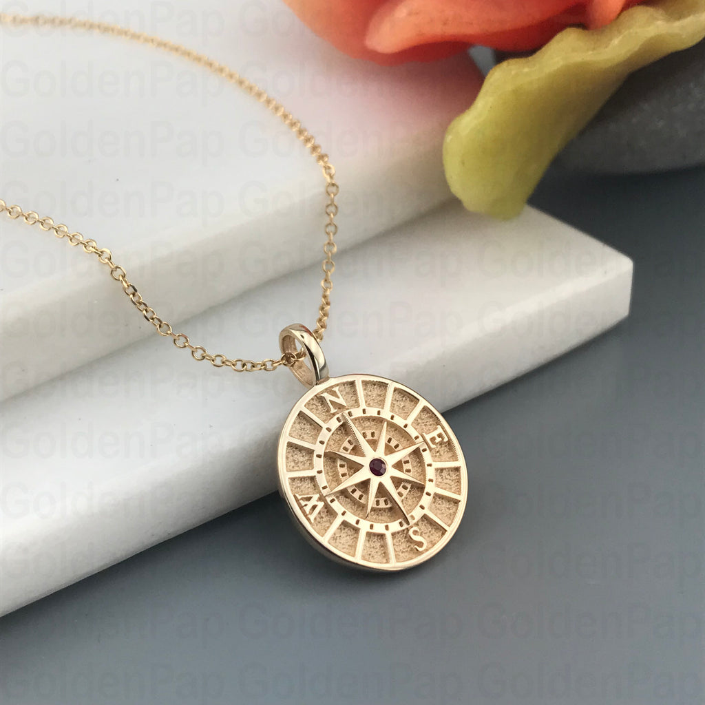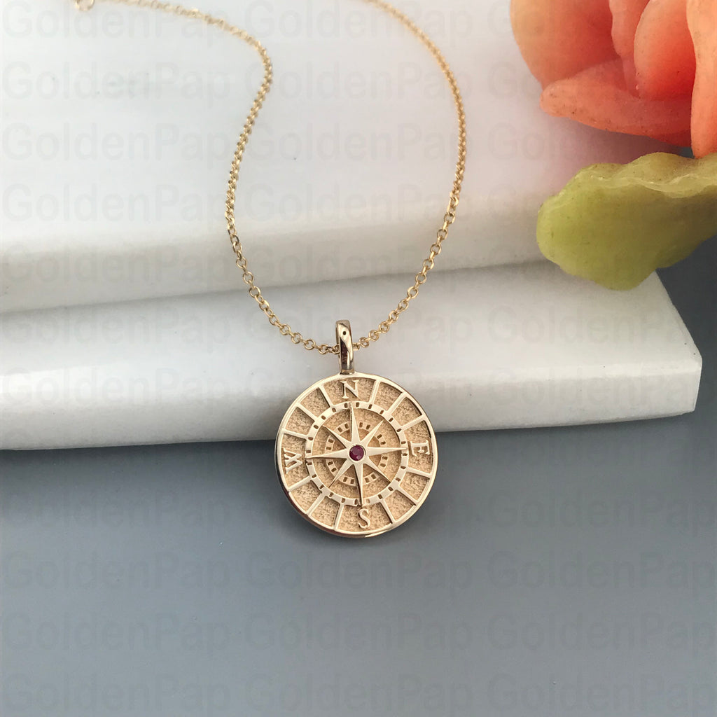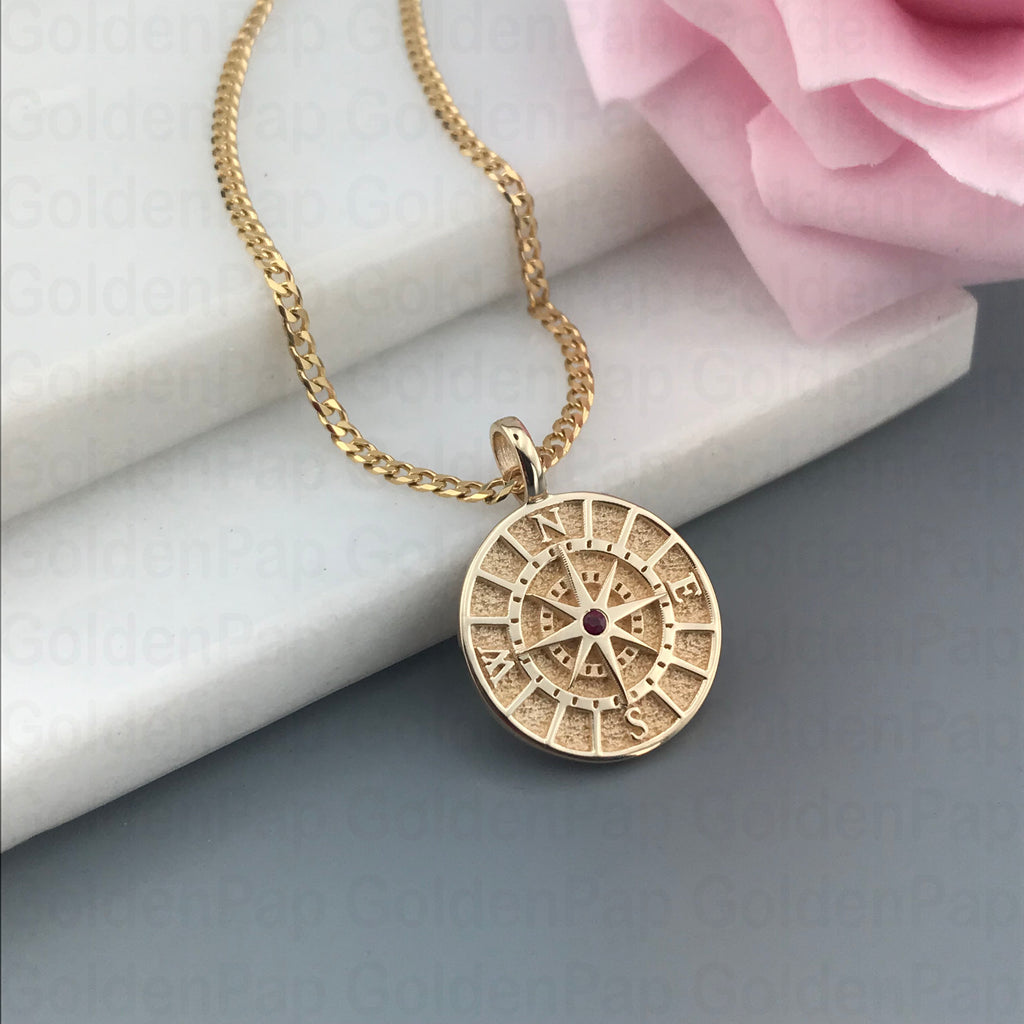 14k solid gold compass pendant with natural emerald (RP125)