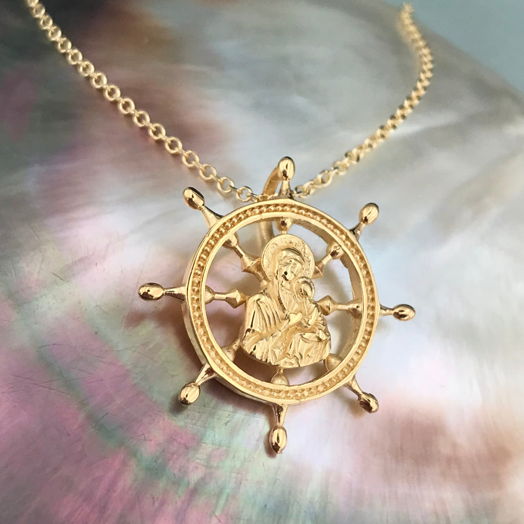 14k solid gold pendant, Nautical Steering Wheel with Virgin Mary(SKU: RP4)