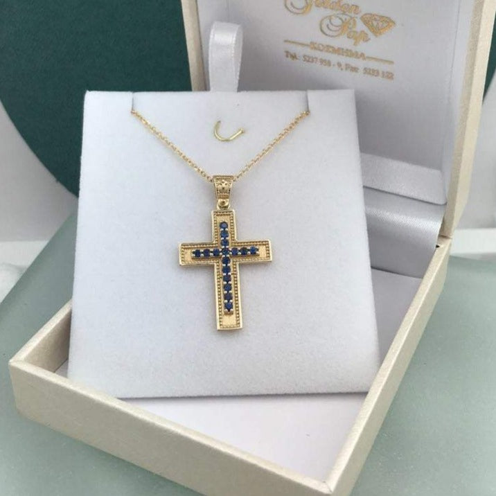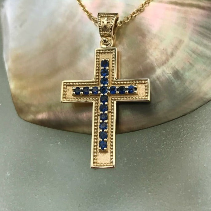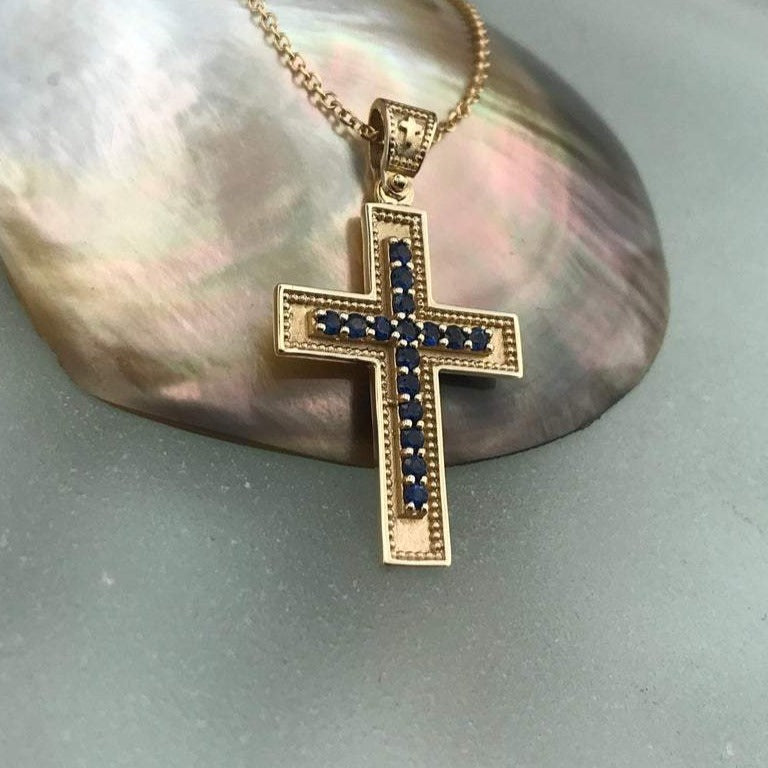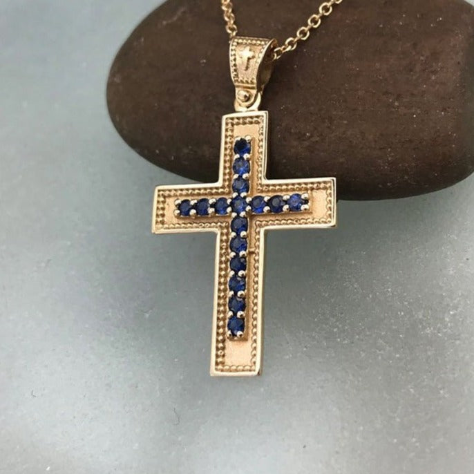 14k Solid gold cross with sapphires (sku: CRTR19)