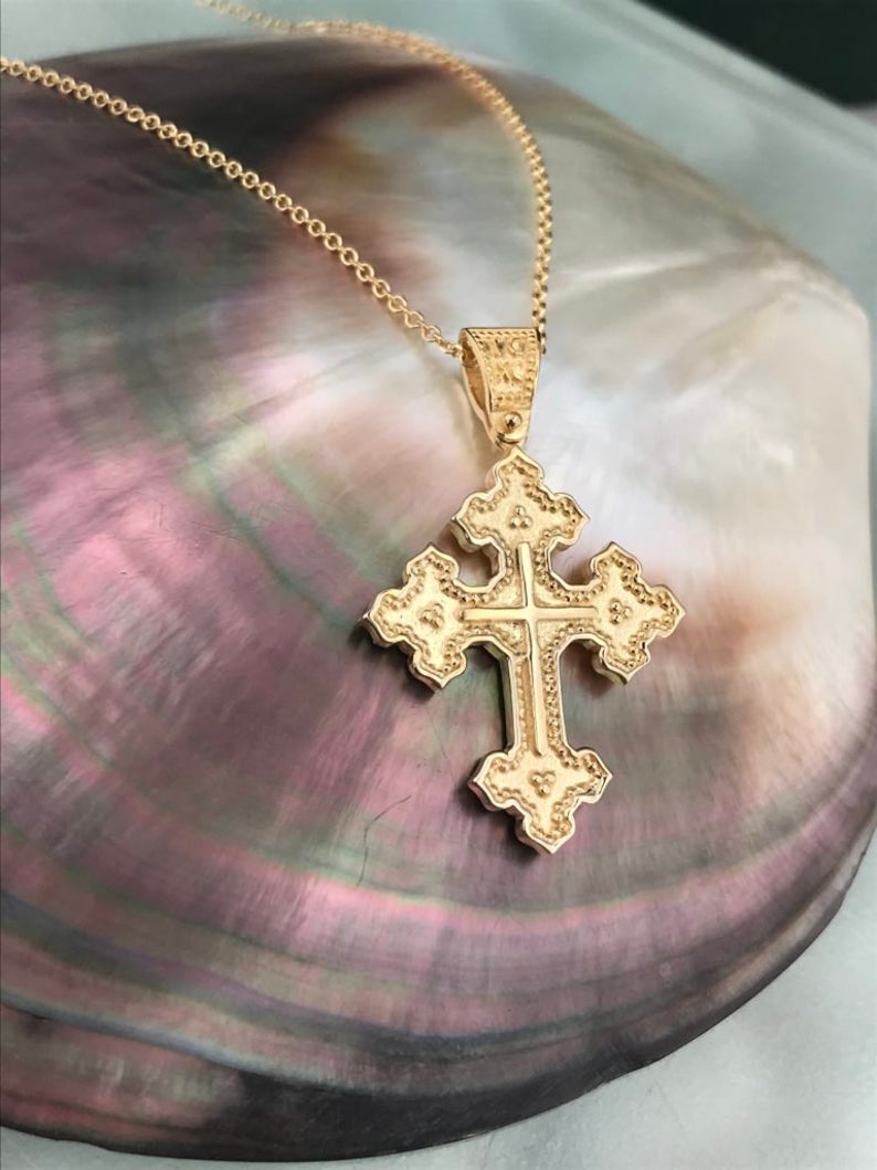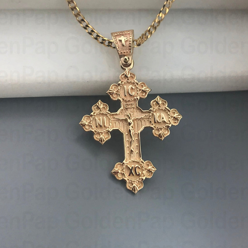 14k solid gold cross with Jesus Christ, double sided cross (sku: CRTR14)